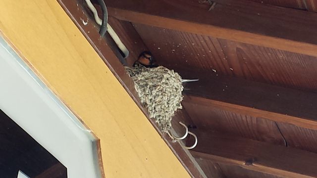 親ツバメと軒先の板の色が同じなのでちょっと見にくいですが、