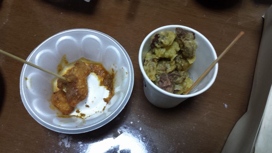 ↓ 右のカップに牛ホルモンの天ぷら(美味い、美味い、美味い)
