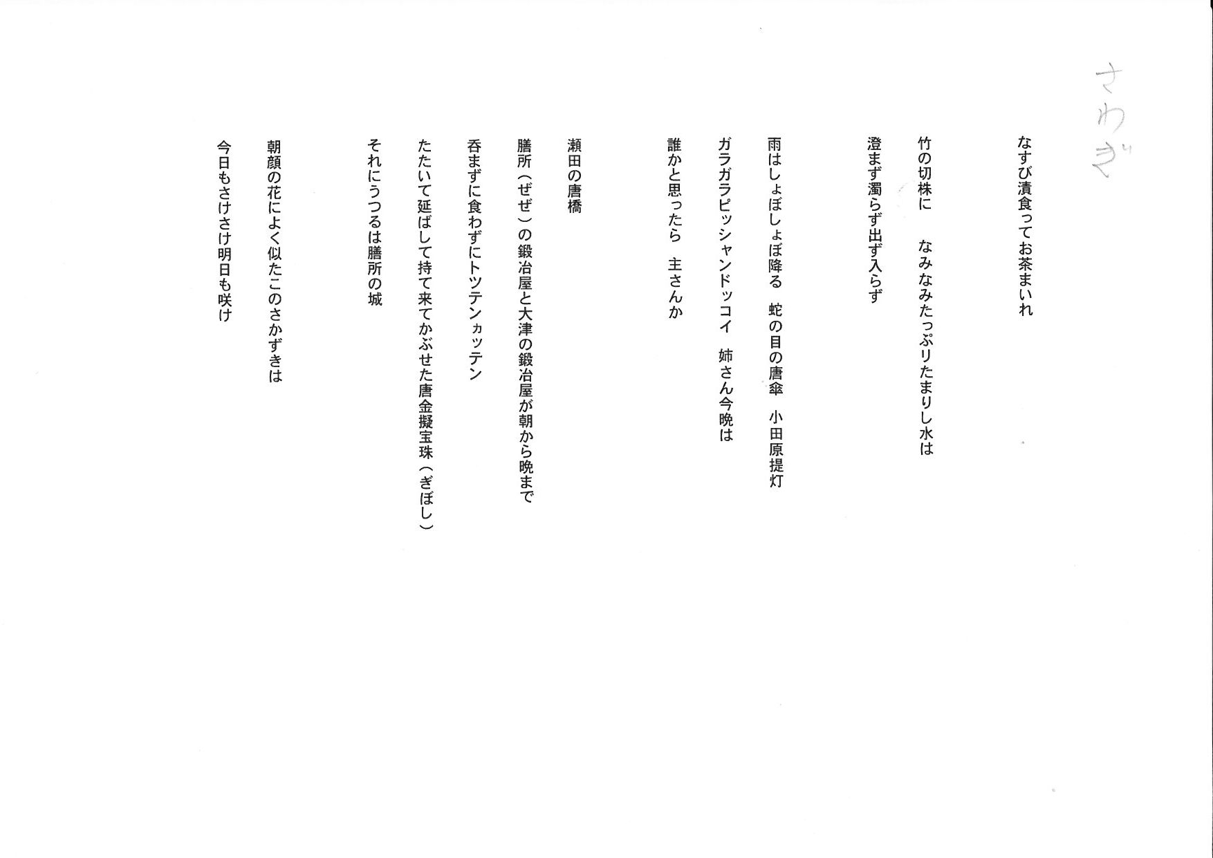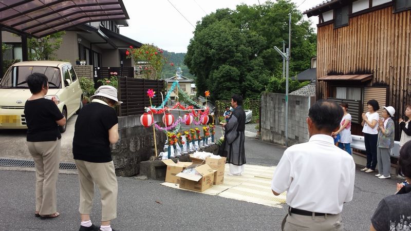 8月23日は地蔵盆で、私の誕生日で、 63歳になります。 50歳を超えると、誕生日目出度くもあり目出度くもなし、 らしいです。 けれど、町内では こんなに盛大にお祝いをしていただきます。 お祝だって思っているのは私だけです。 16時から蓮乗寺住職のお勤めを頂きました。 今にも降りそうな空模様も 晴れ男の私の祈りでなんとか持っています。 画像で分かるかしれませんが、 子どものほとんどいない地蔵盆です。 今に始まったことでもないのですが。 最後に嬉しいお下がりをいただきました。 夜は、石部中央区の18時から役員会、 その後20時から夏の役員懇親会でした。 先日の郡上踊りで思い出したことがあります。 10個の踊りがあるなかで「さわぎ」と言う囃子があります。 普通は踊りに気を取られてあまり囃子の中味は聞かないのですが、 ところどころ、「膳所」とか「大津」とかの言葉が出て来て、 「ン」となりましたがその場では確かめようがありません。 ネットで「郡上踊り 近江八景」で検索すると引っかかりました。 膳所の鍛冶屋と大津の鍛冶屋が・・・と、歌われています。 さわぎ